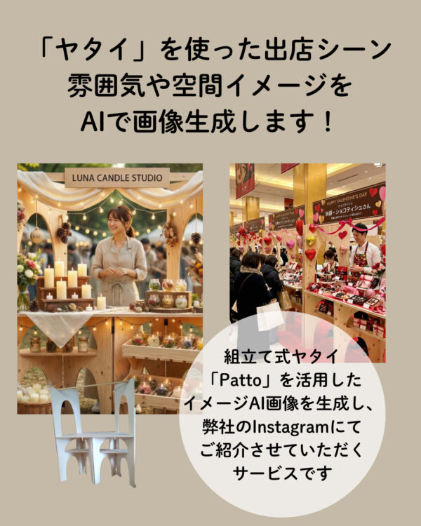 組立式ヤタイ「Patto」を活用した場合のイメージAI画像を、老津木工のスタッフが専用アプリを使い生成するサービスです✨